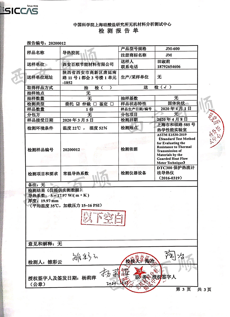•        西安百順節能材料有限公司成立于1998年,二十五年來,我們專心、專注于導熱膠泥產品的研發、生產;企業通過ISO9001:2015質量管理體系認證,制定了Q/BS 001-2020《無機型導熱膠泥》企業標準,經過不斷的研發、優化,成功開發、生產、銷售了針對不同工藝、不同材質、方便施工的JM-250、JM-600、JM-800、JM-1000系列導熱膠泥,年生產能力2000噸;